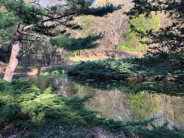 Depending on the season, there is a house or two visible in the distance, as the pond is close to my street (which is very quiet most of the time). If I sit on my front porch I can see and hear the pond and the babbling brook that feeds into it. There is also space close to the pond to sit and relax. Over the last year I have watched the daily changes and have marveled in the animals that come to visit. In the evening, the sounds of crickets and frogs mingling with owls and other night creatures creates a symphony that changes daily.